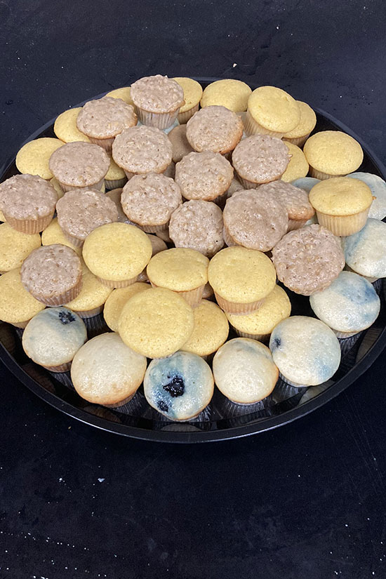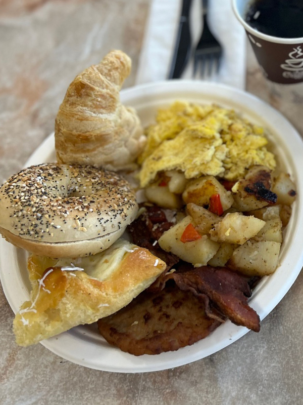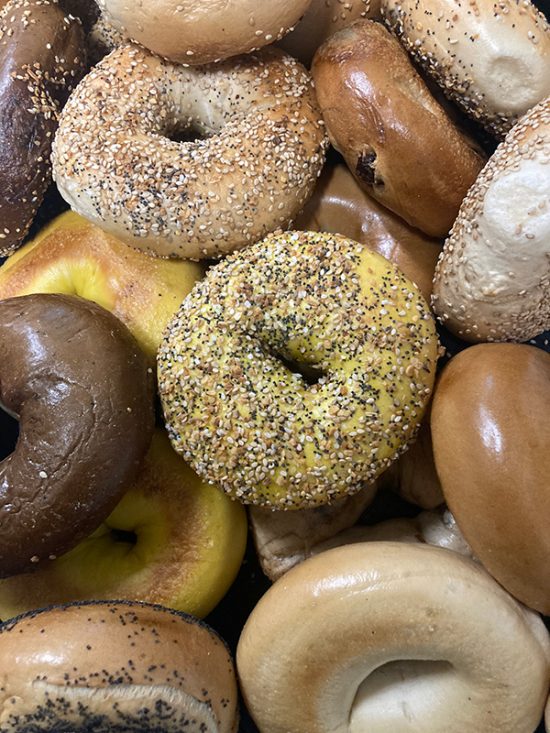 We have plain, sesame, everything, cinnamon raisin, whole wheat plain, whole wheat everything, garlic, onion, pumpernickel, multigrain, egg, egg everything, French toast, Flagel’s, mini bagels